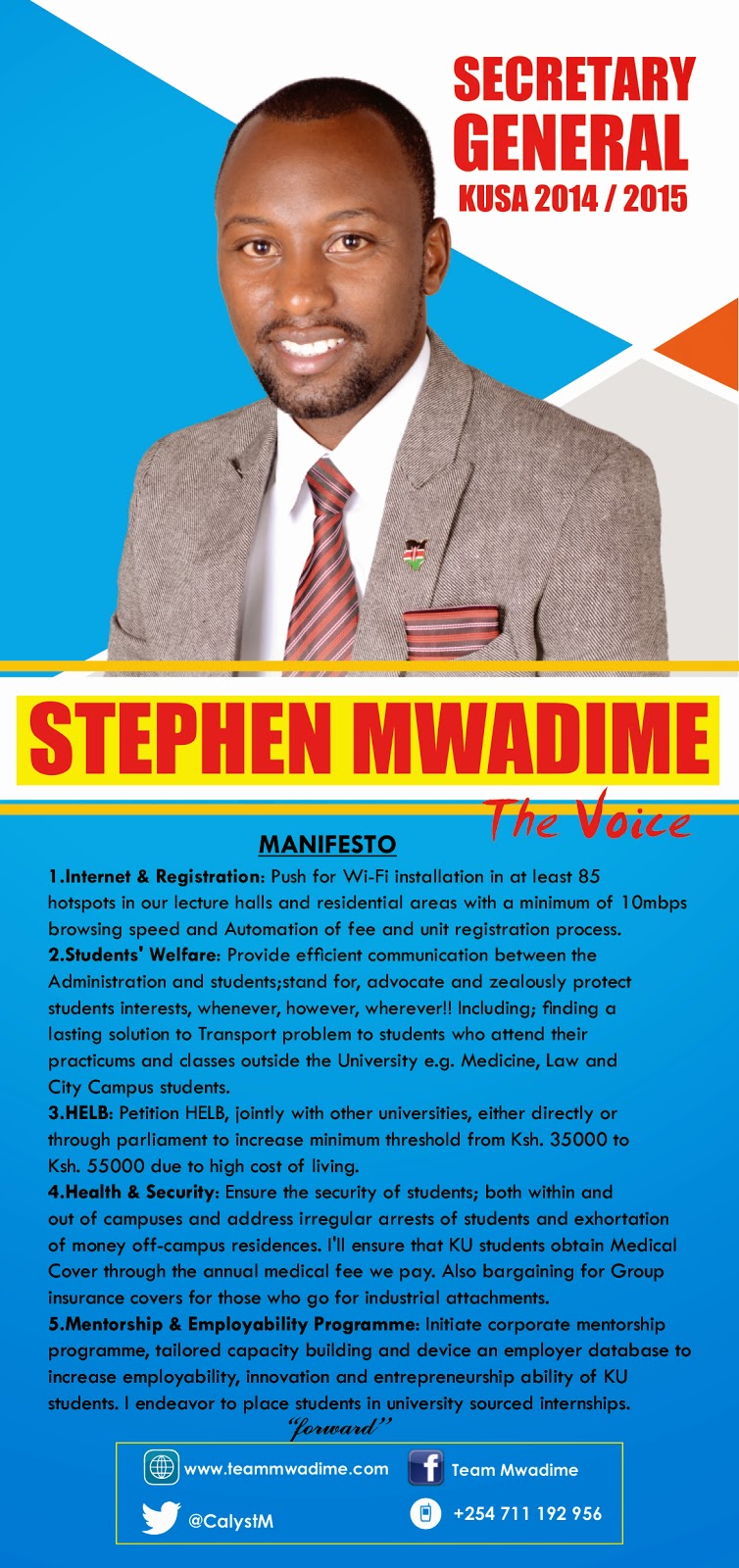 The general mindset behind those in power is mostly negative in majority of those they serve with many a times being characterized with unmet expectations and unhonoured promises. This has been our Kenyan political scenario but closer to you the comrade is the KUSA executive who majority of us still have many grievances. Edging closer to the thinking of a leader, I sat down with Stephen Mwadime the current secretary general of KUSA 2014-2015.